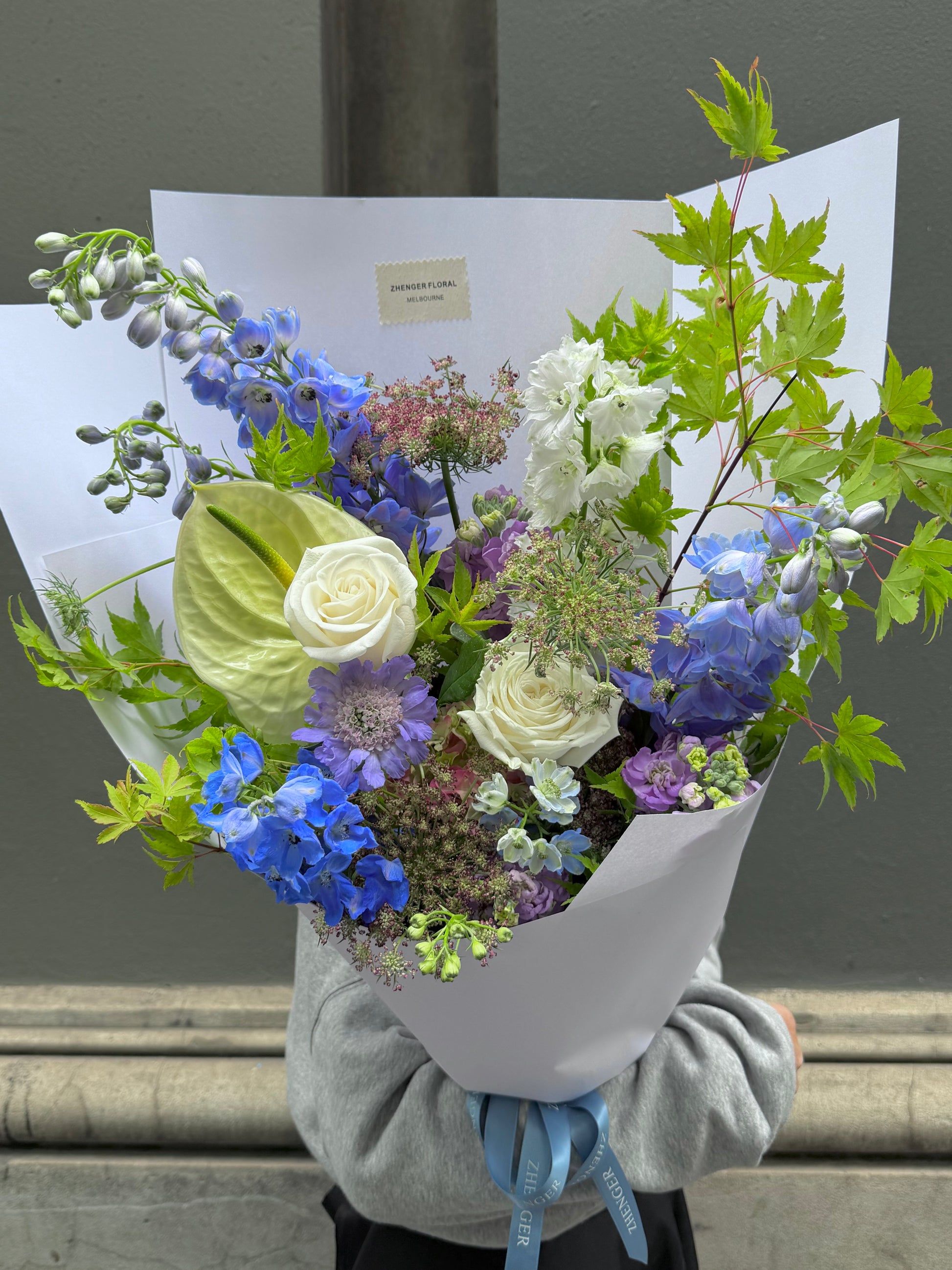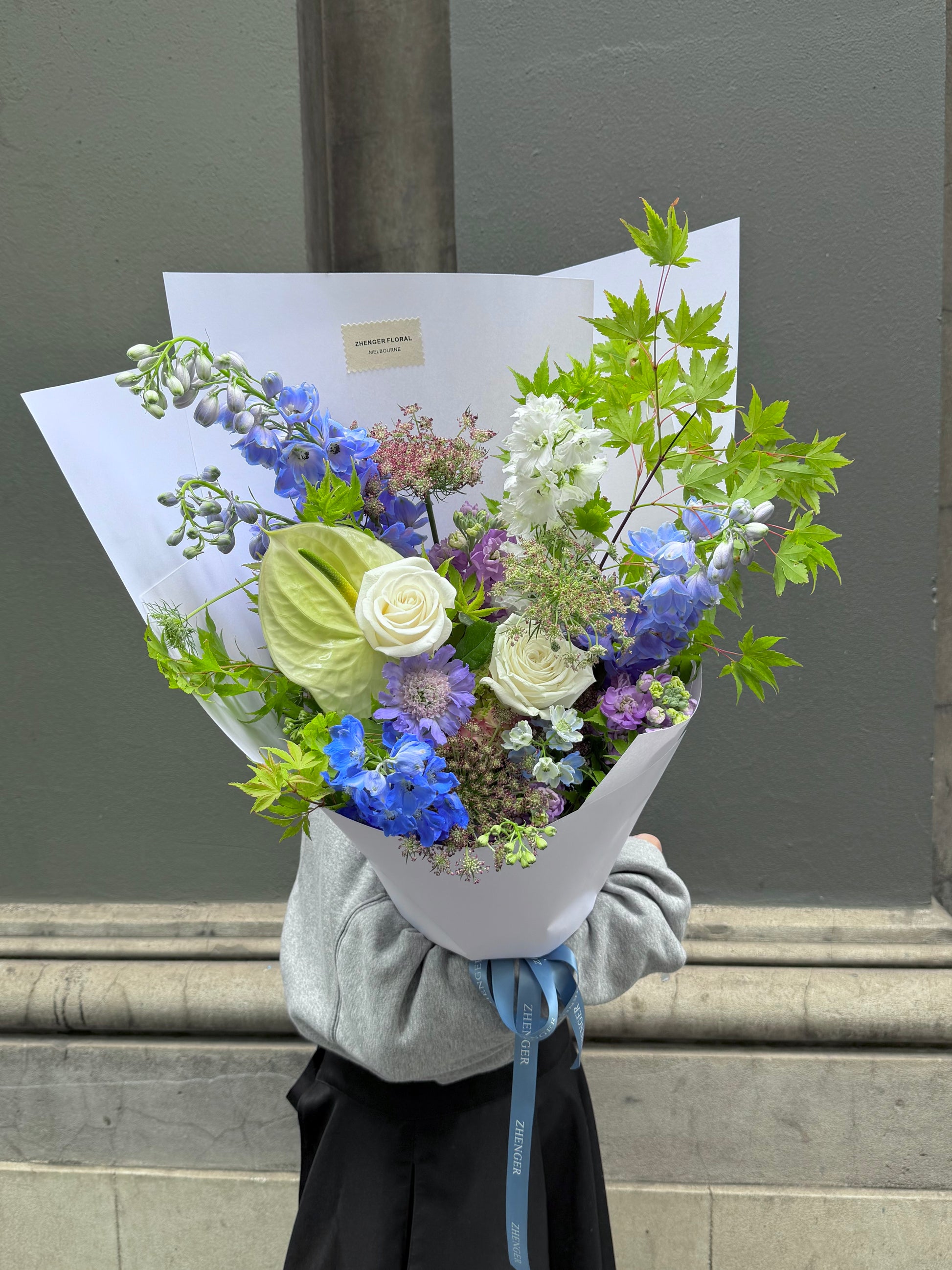 A modern, gender-neutral bouquet designed with refreshing blue, white, and green tones. Featuring elegant white roses, vibrant delphiniums, delicate scabiosa, and maple foliage, this arrangement blends softness with contemporary structure. Perfect for graduation, congratulations, or everyday gifting, it brings a calm, uplifting presence to any moment.