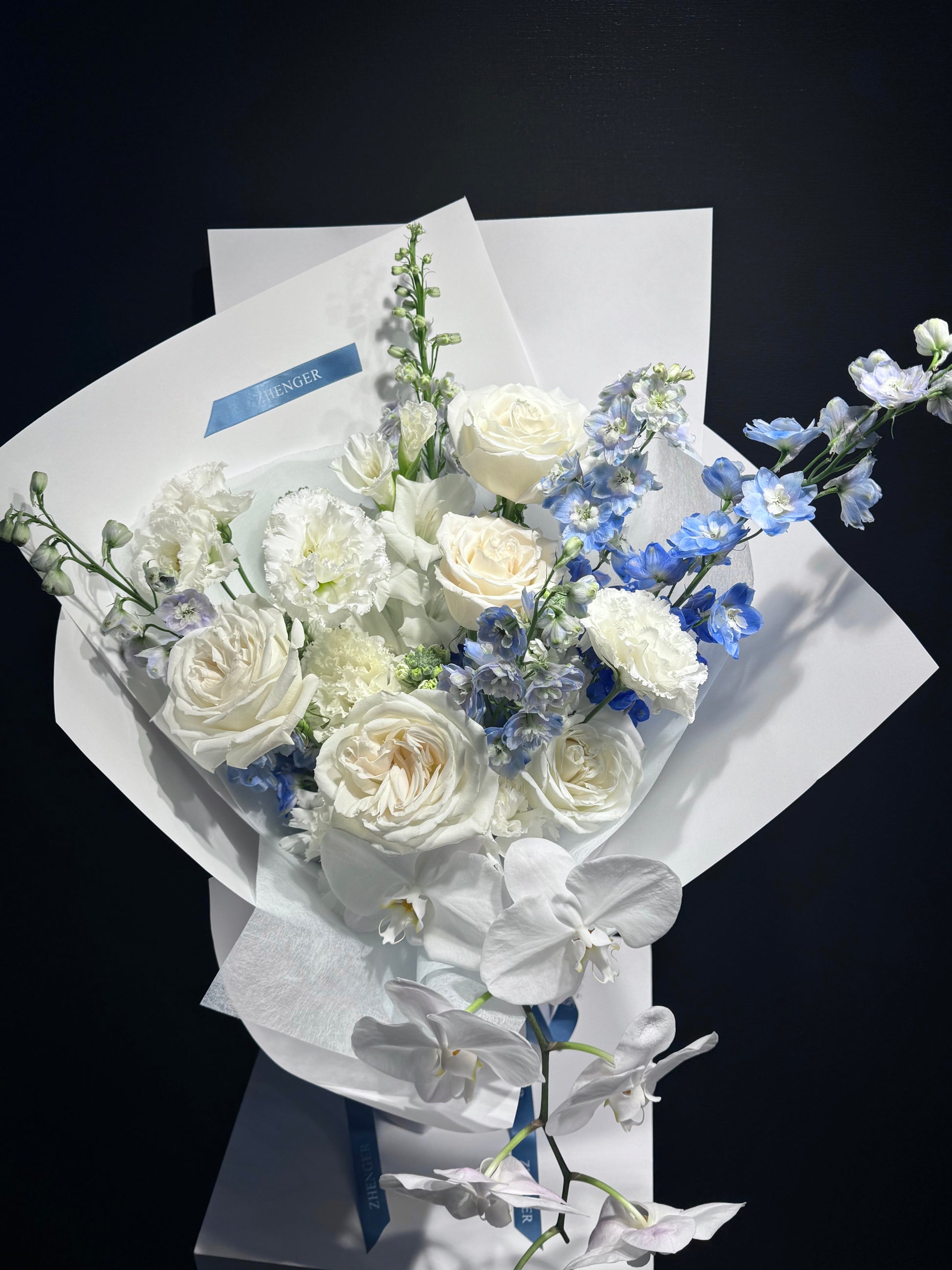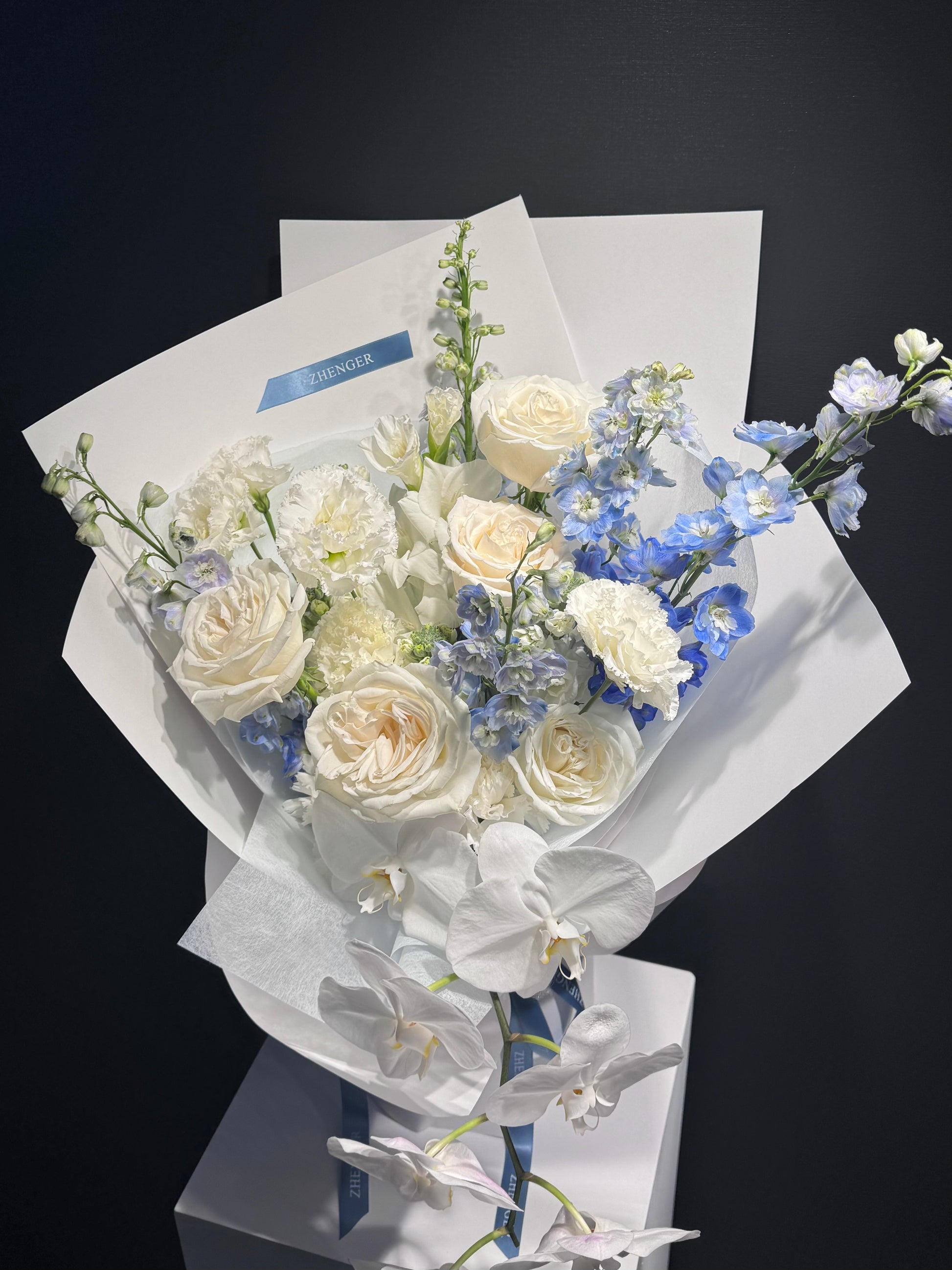 A refined bouquet featuring pristine white roses, delicate phalaenopsis orchids, and soft blue delphiniums. The serene blend of white and blue evokes purity, tranquility, and timeless elegance — perfect for celebrations of love, gratitude, Birthday, graduation or new beginnings.