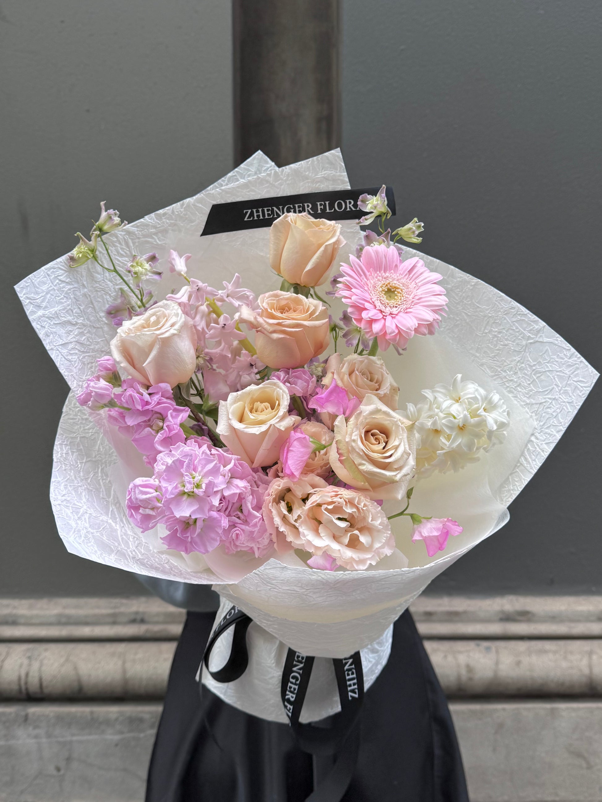 A graceful arrangement of soft blush roses, pastel pinks, and creamy whites. “Blush Serenade” is a gentle melody of elegance and tenderness — perfect for expressing love, gratitude, or sweet admiration.