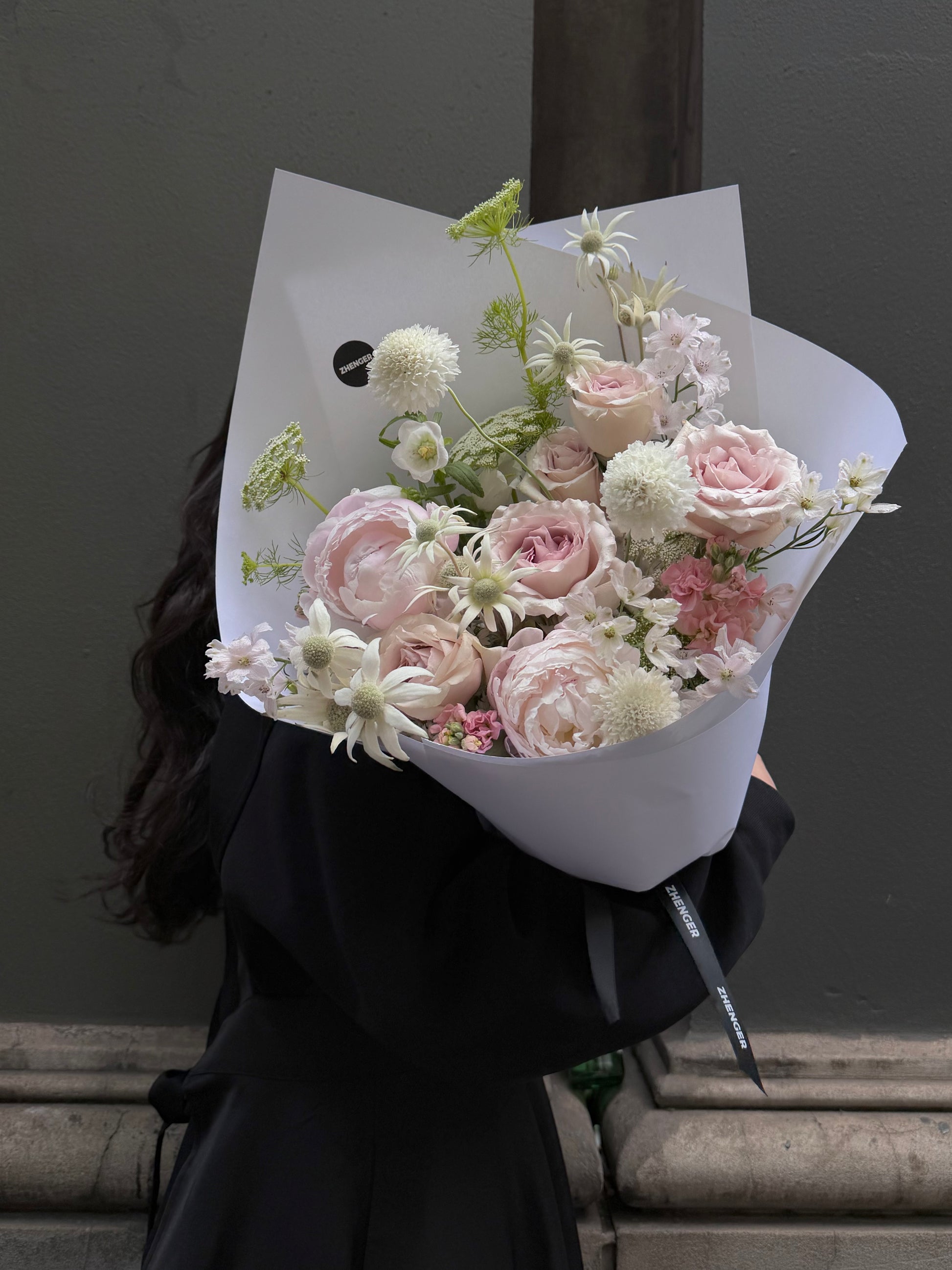 A soft and elegant bouquet designed in gentle blush and ivory tones. Its airy and romantic style makes it perfect for birthday, graduations, celebrations, anniversaries, or any moment where you want to express warmth and heartfelt wishes. A timeless and gender-neutral arrangement that brings a sense of calm, beauty, and quiet charm.