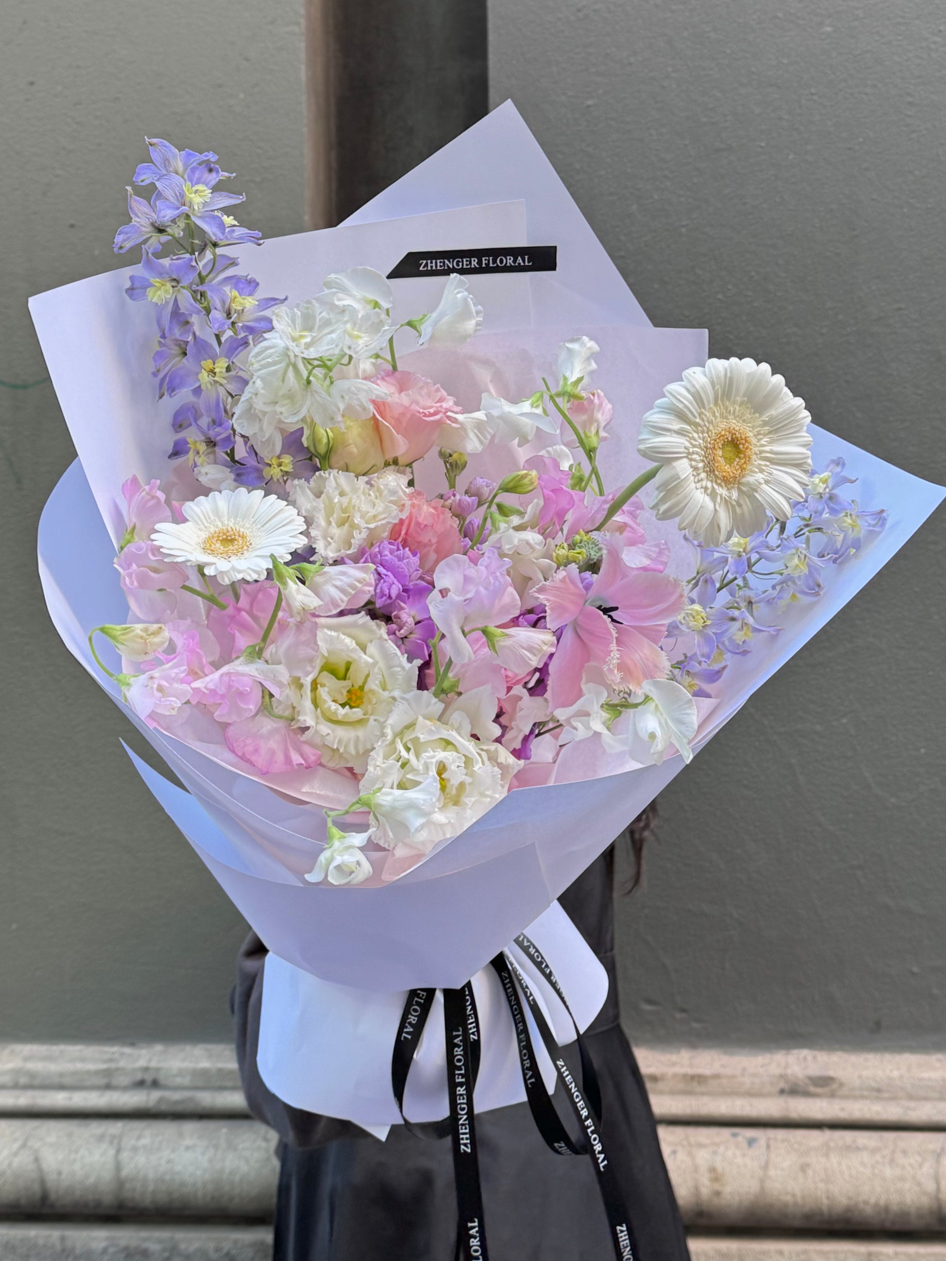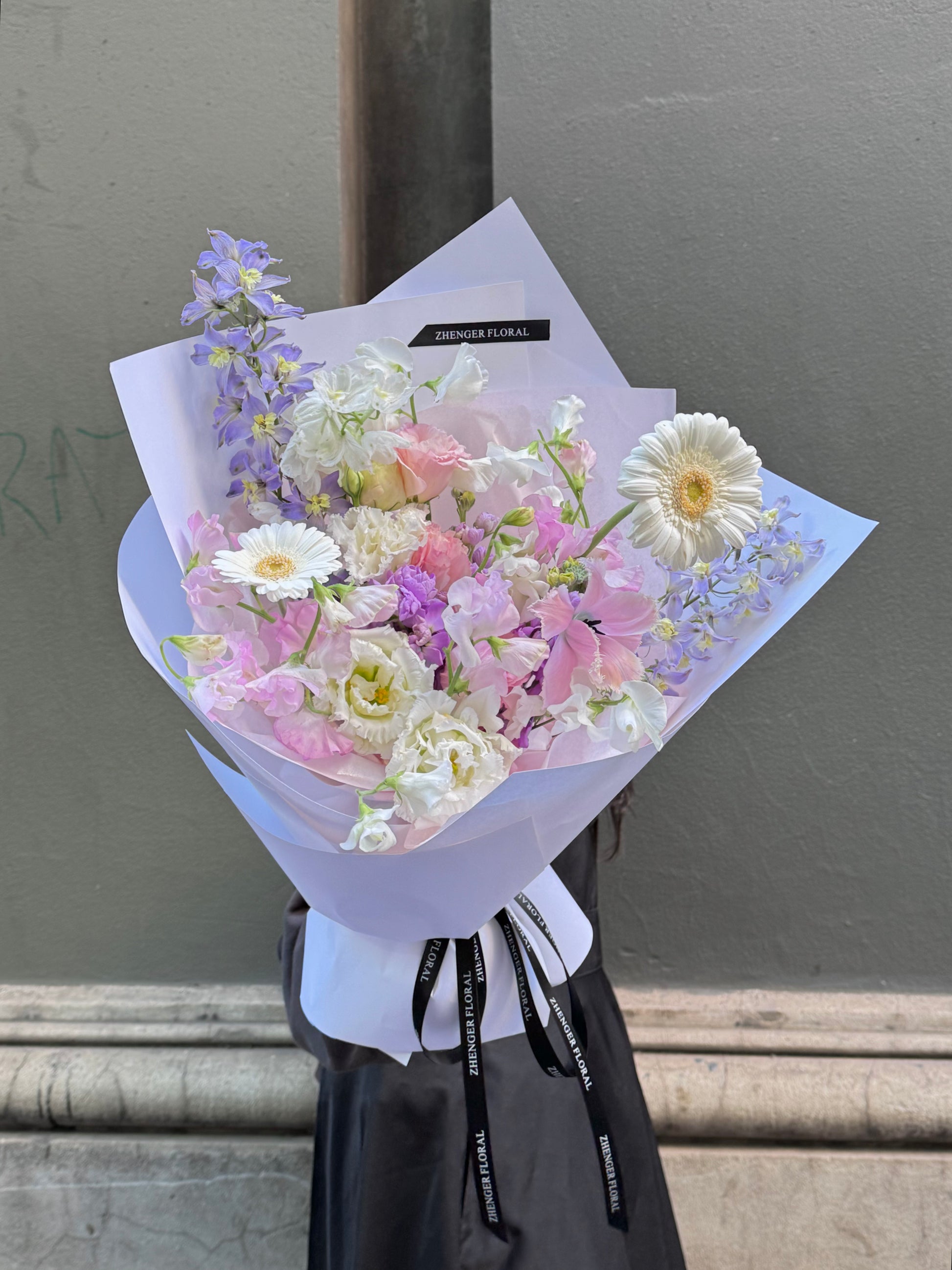 A delicate medley of blush pinks, creamy whites, and soft lavender — this bouquet is a dreamy swirl of lisianthus, sweet peas, gerberas, and airy delphinium. Light and graceful like buttercream clouds drifting across a pastel sky, it’s perfect for birthdays, anniversaries, graduation or simply to brighten someone’s heart.