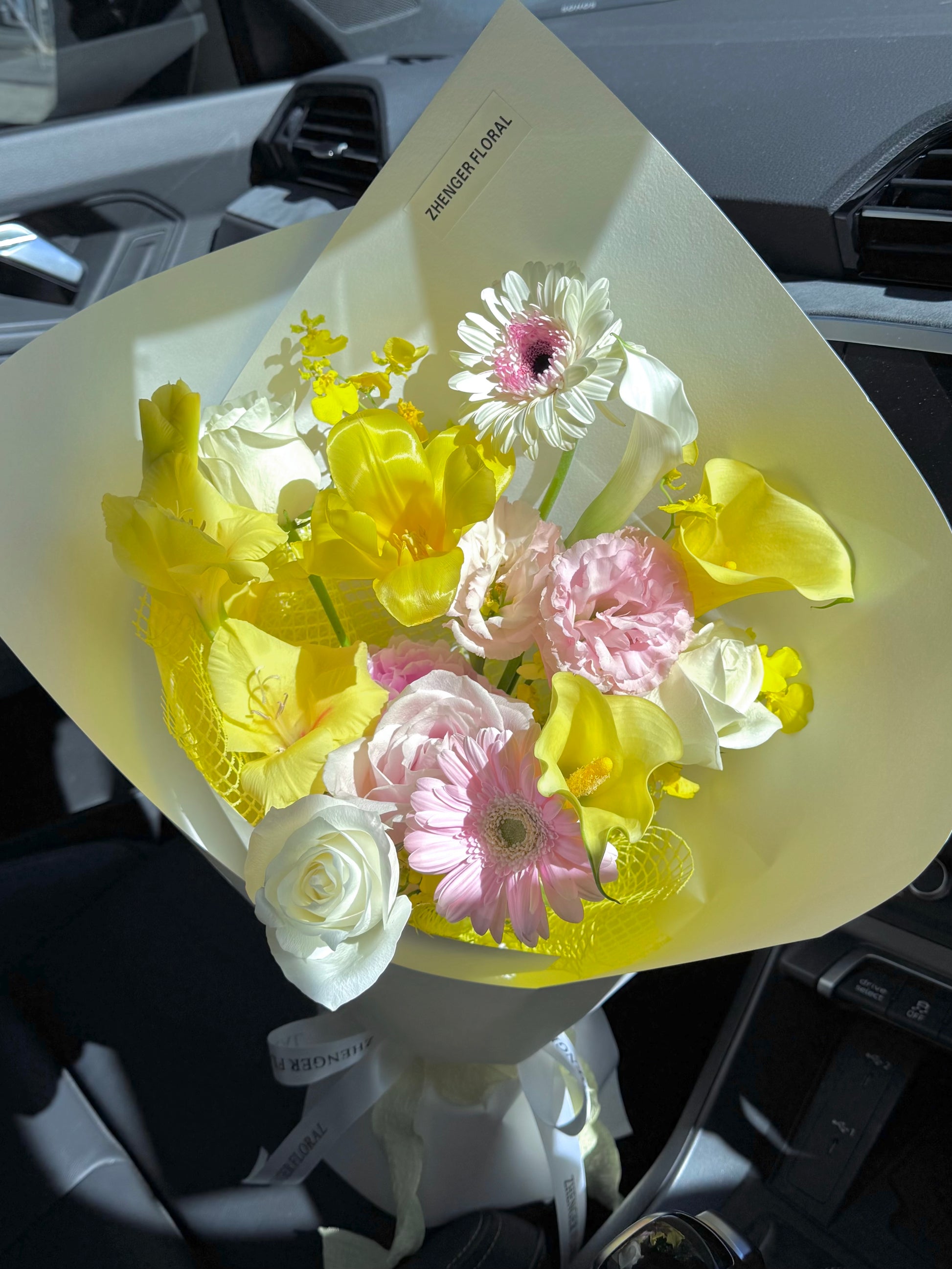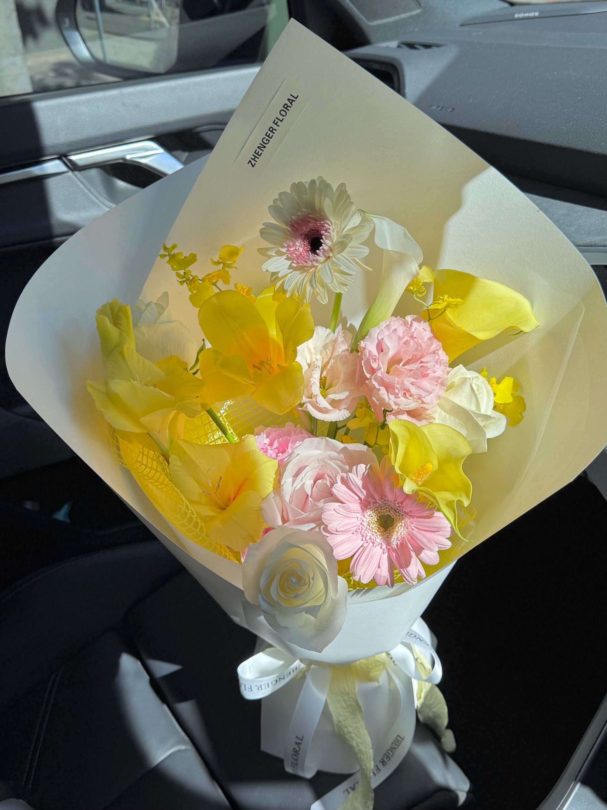 A luminous symphony of buttery yellows, tender blush pinks, and pure whites, blending tulips,mini gerberas, carnations, lisianthus, calla lilies, and roses. Like the first sun-kissed rays over a pastel horizon, it’s soft, uplifting, and utterly enchanting.