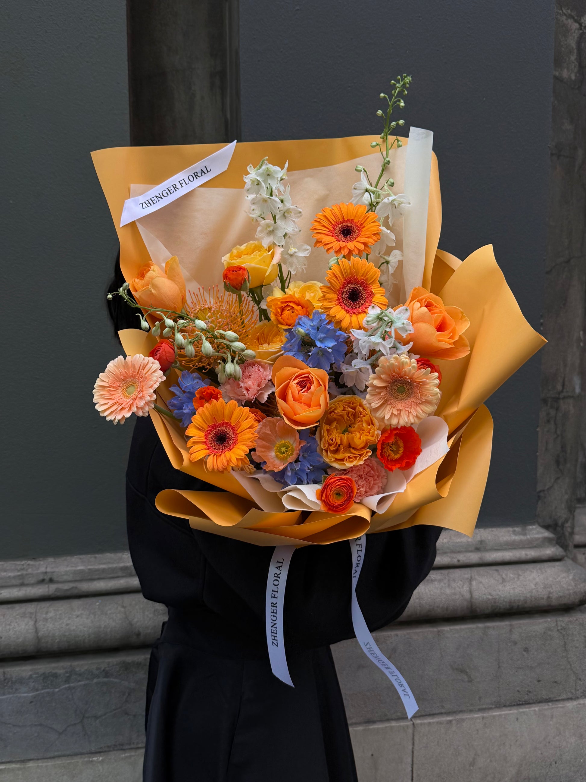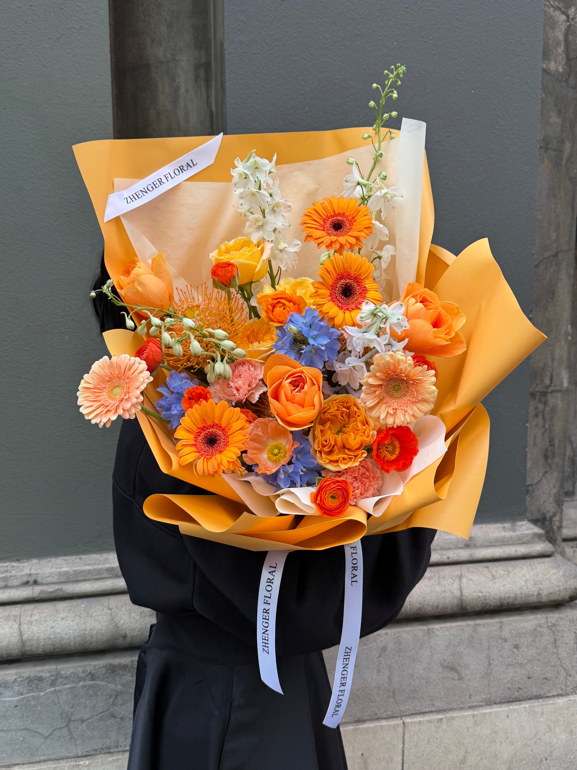 A warm and radiant bouquet glowing with shades of amber, orange, and soft peach. Featuring premium roses, vibrant gerberas, delicate delphiniums, and textural seasonal blooms, this arrangement captures the essence of glowing embers—bright, energetic, and full of life. Wrapped in golden paper with a clean, modern finish, it’s perfect for celebrations, graduations, thank-you gifts, or simply lighting up someone’s day. A gender-neutral bouquet designed to bring warmth and joy to any occasion.