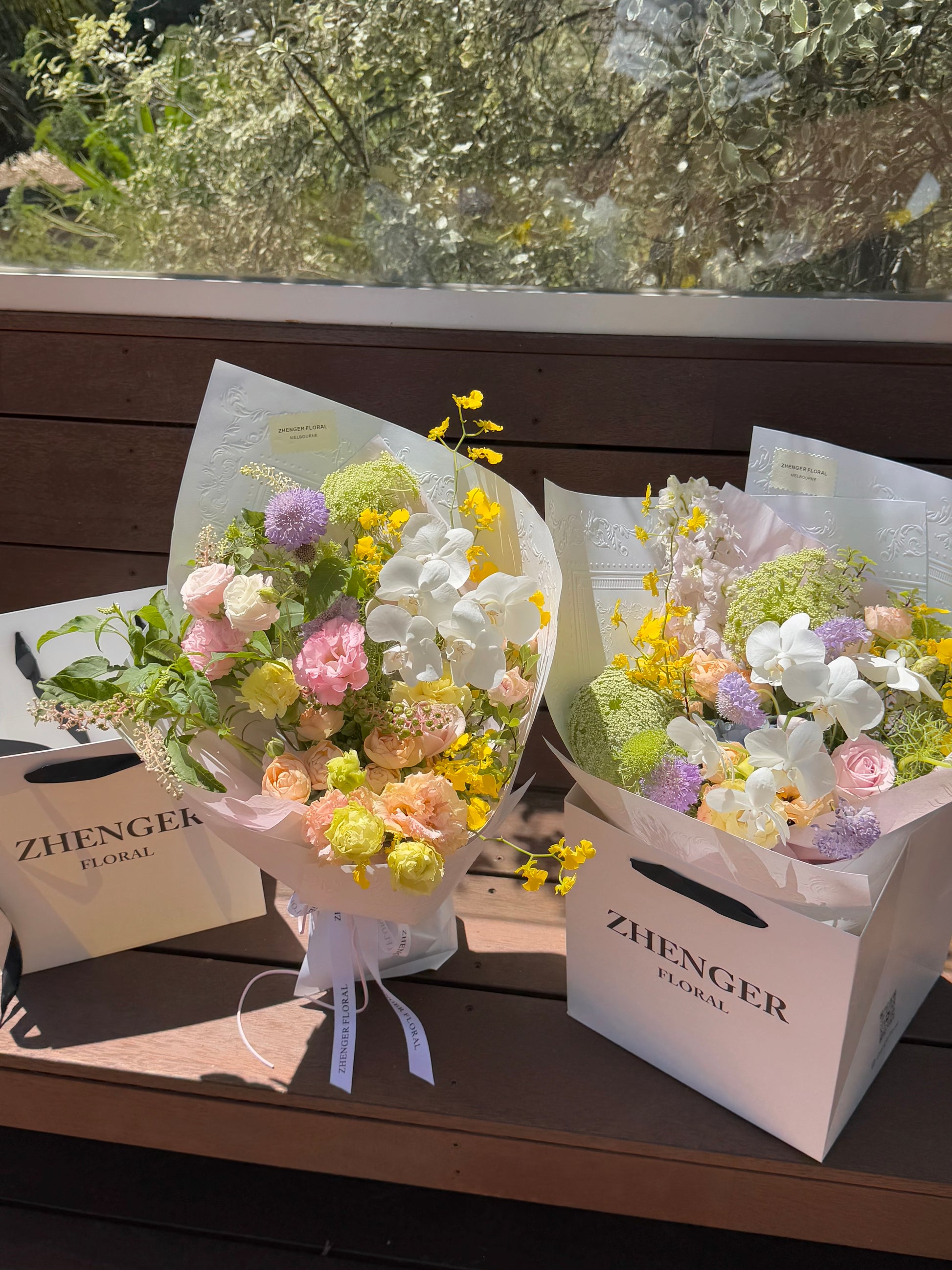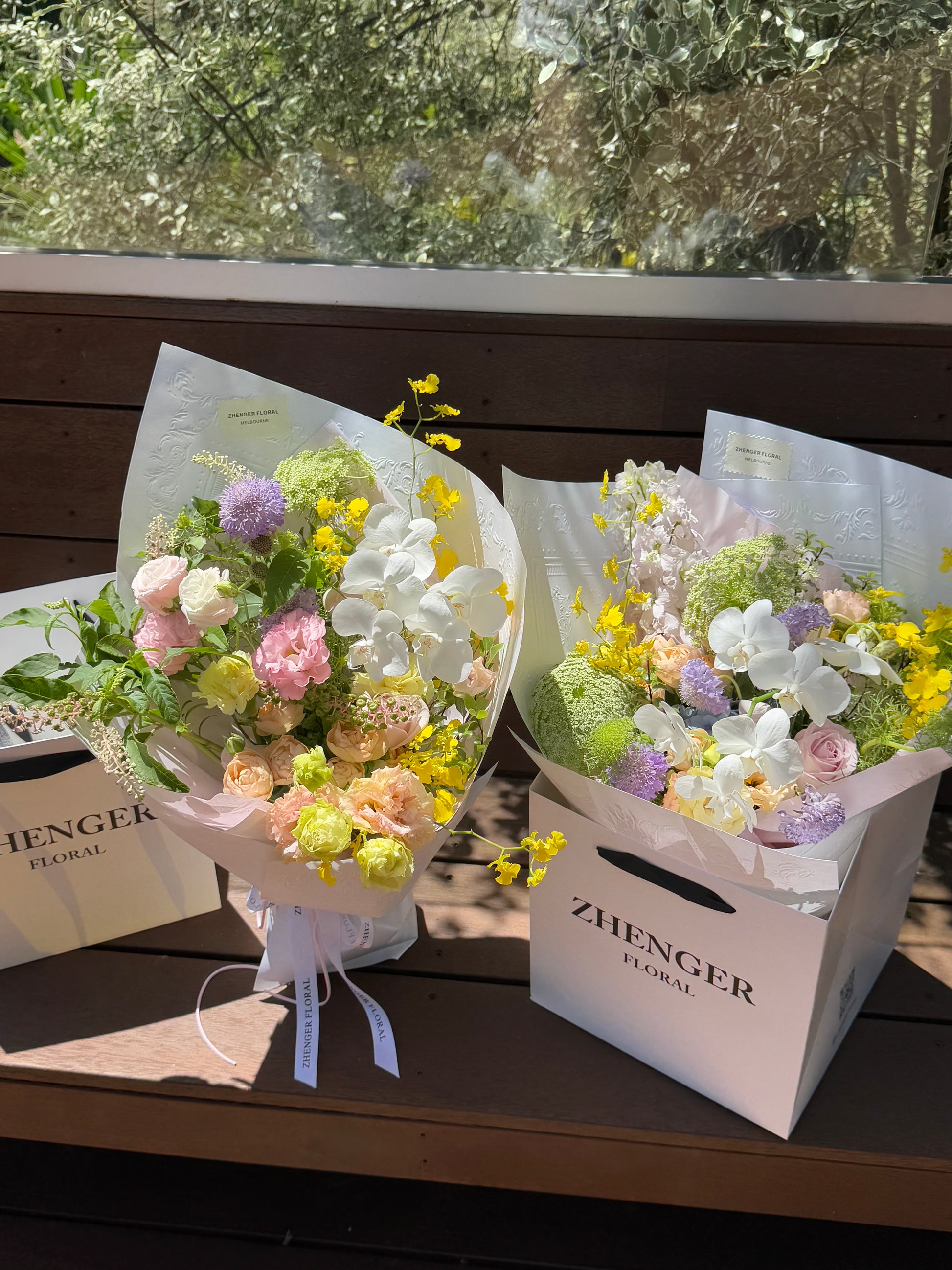 An elegant harmony of Phalaenopsis orchids, Dancing Lady orchids, Queen Anne’s lace, lisianthus, and roses. With soft pastels kissed by golden blooms, this bouquet dances with grace and sunshine.
