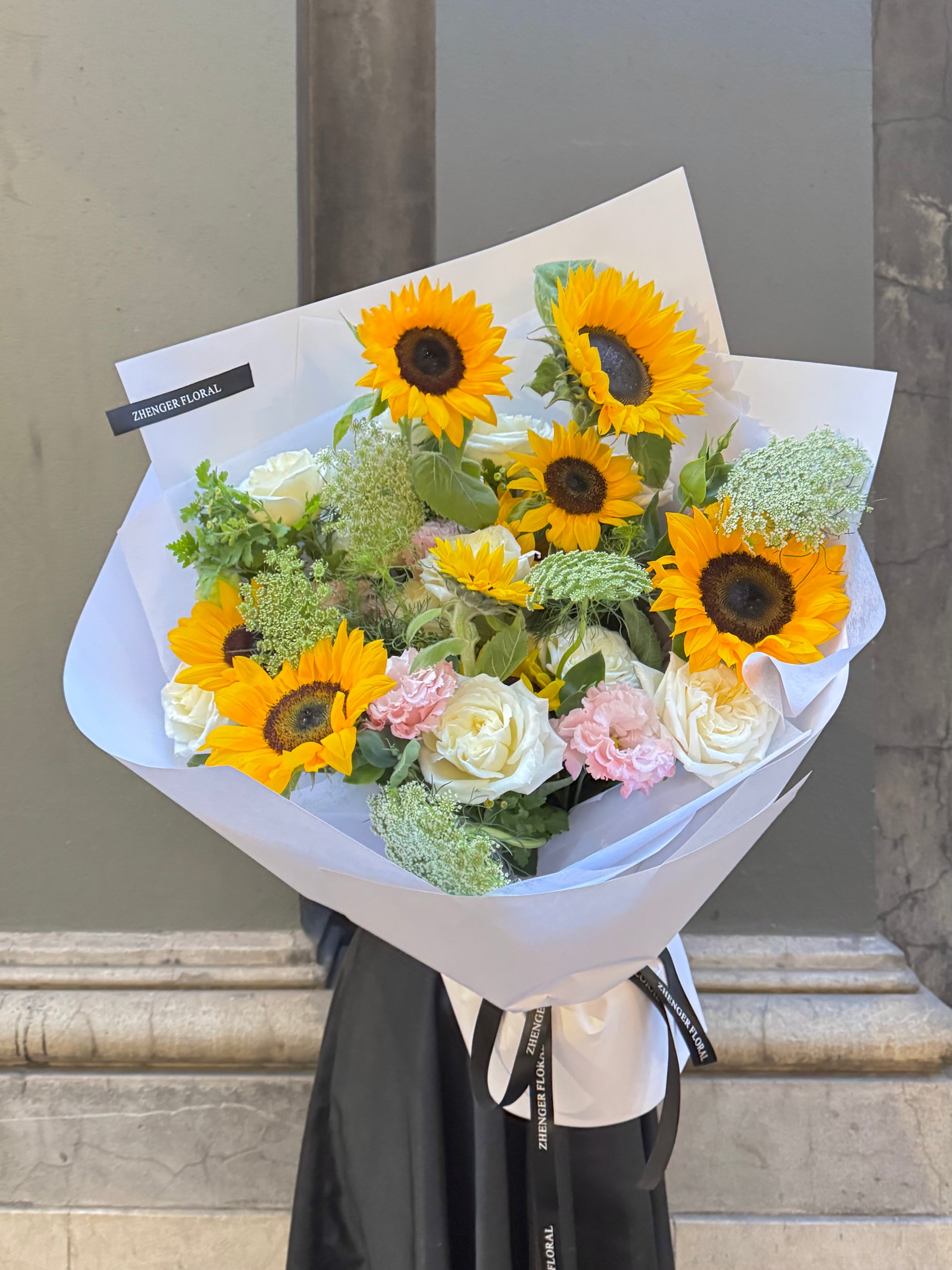 A radiant bouquet of sunflowers, white roses, and blush blooms, designed to bring warmth, joy, and a touch of nature’s cheer. Hello Sunshine is perfect for celebrating milestones, offering encouragement, or simply brightening someone's day with golden light and heartfelt energy.