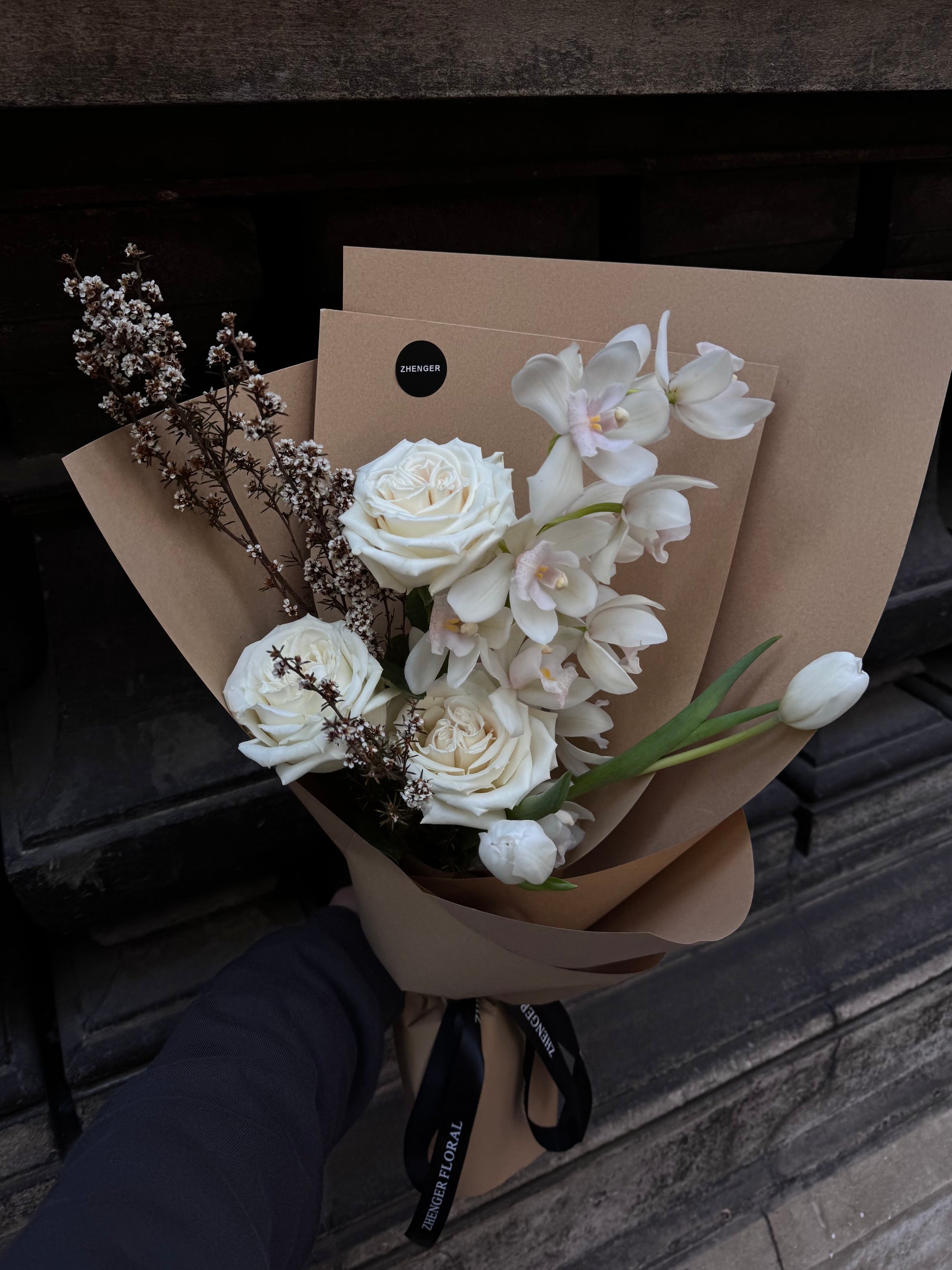A timeless arrangement of pristine white roses, delicate cymbidium orchids, white tulips, and ti tree, wrapped in earthy kraft paper. This bouquet exudes quiet elegance, capturing the beauty of simplicity and refined grace.