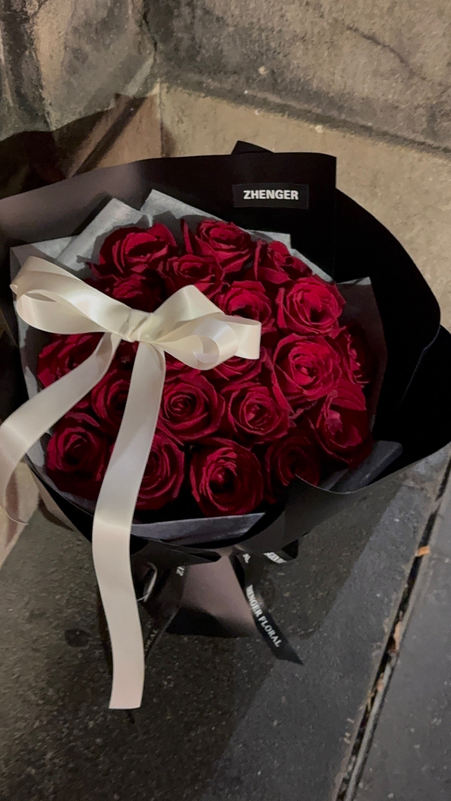 Scarlet petals and a soft white tie, like a letter sealed with care.