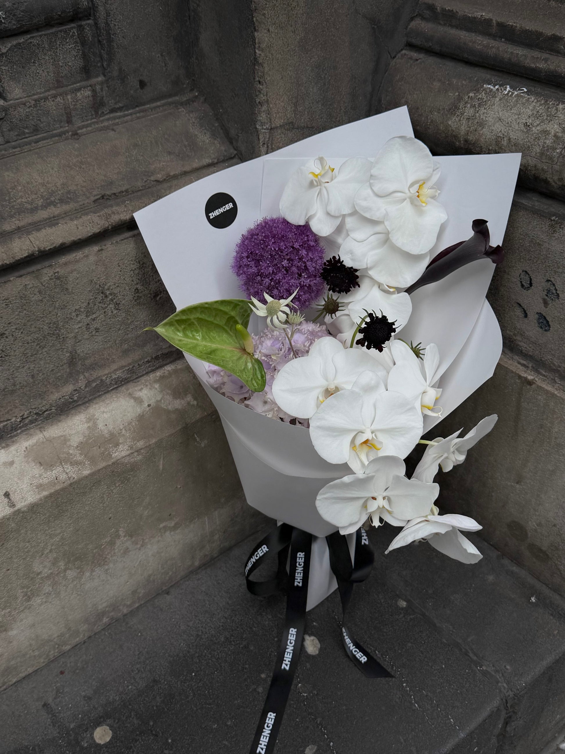 A refined bouquet centred around cascading phalaenopsis orchids, styled in a cool white-and-purple palette. Elegant, modern and effortlessly luxurious — perfect for graduations, milestones, and meaningful celebrations.