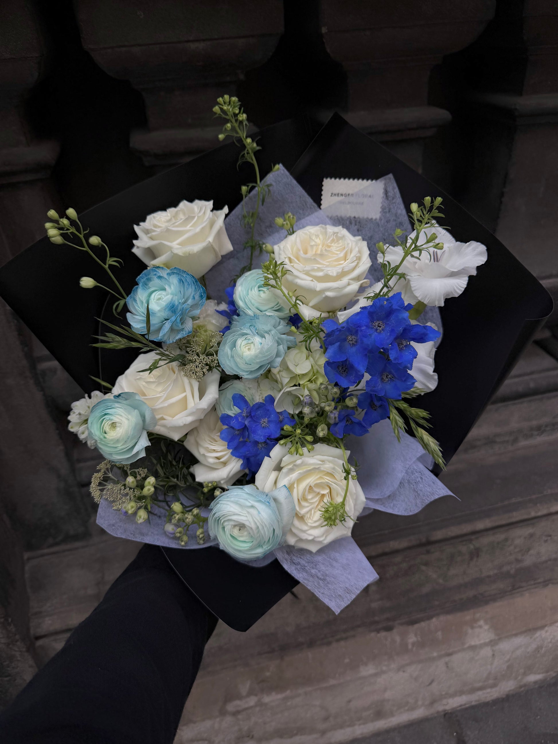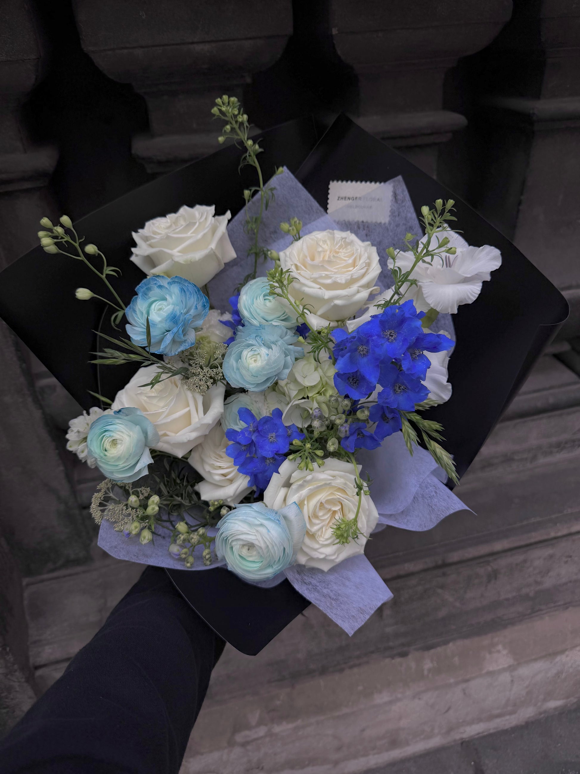 A graceful bouquet of crisp white roses, delicate carnations, and soft blue tulips wrapped in sleek black paper. Midnight Snow captures the elegance of winter’s quiet charm, perfect for expressing calm, purity, and timeless affection.