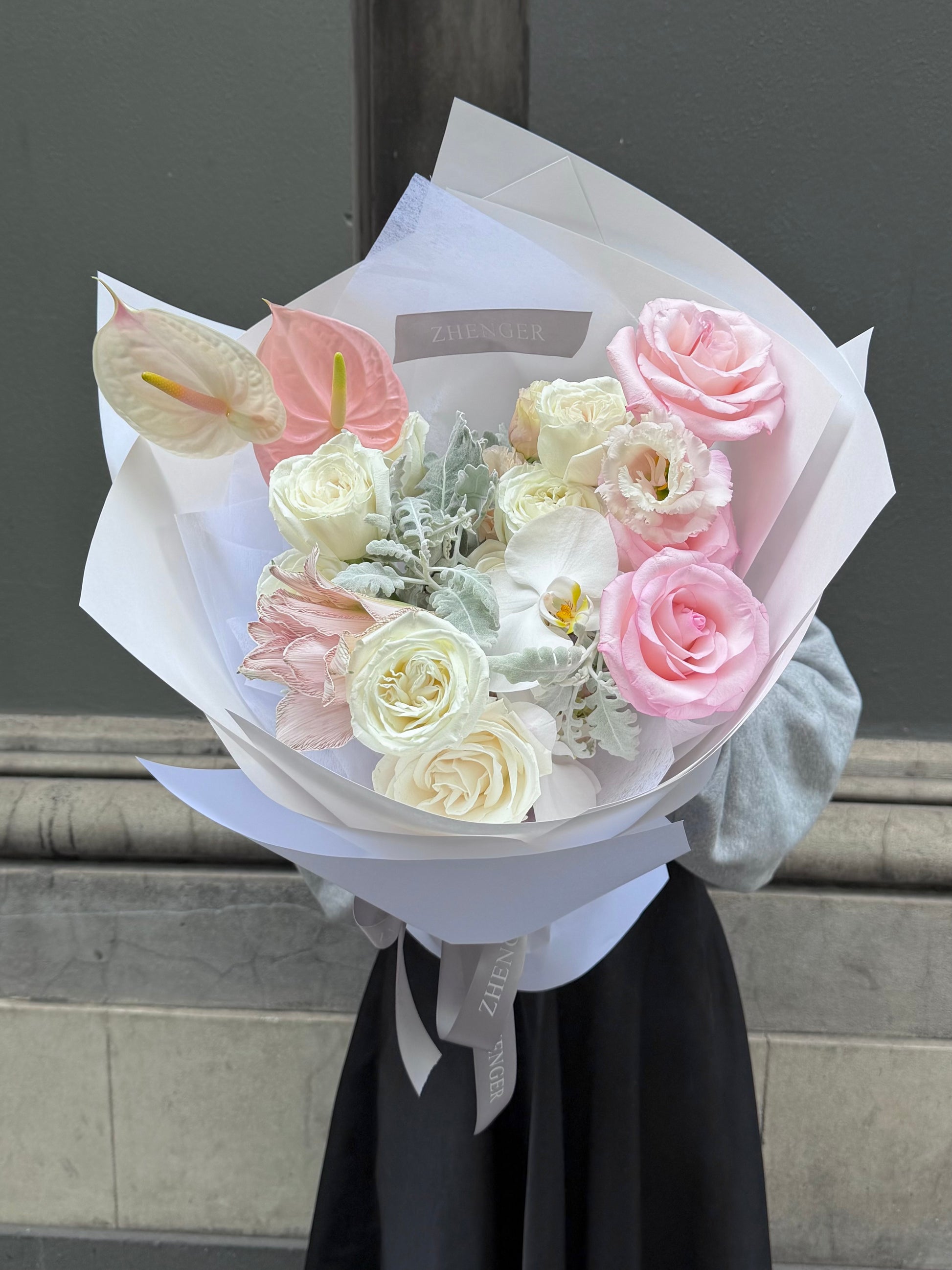 Soft, comforting, and quietly refined, Pale Embrace evokes a sense of gentle warmth and understated romance. With its light, airy presence and harmonious tones, it feels like a tender moment frozen in time effortless yet deeply considered. A timeless choice for celebrations, meaningful milestones, or simply to express care in the most beautiful way.