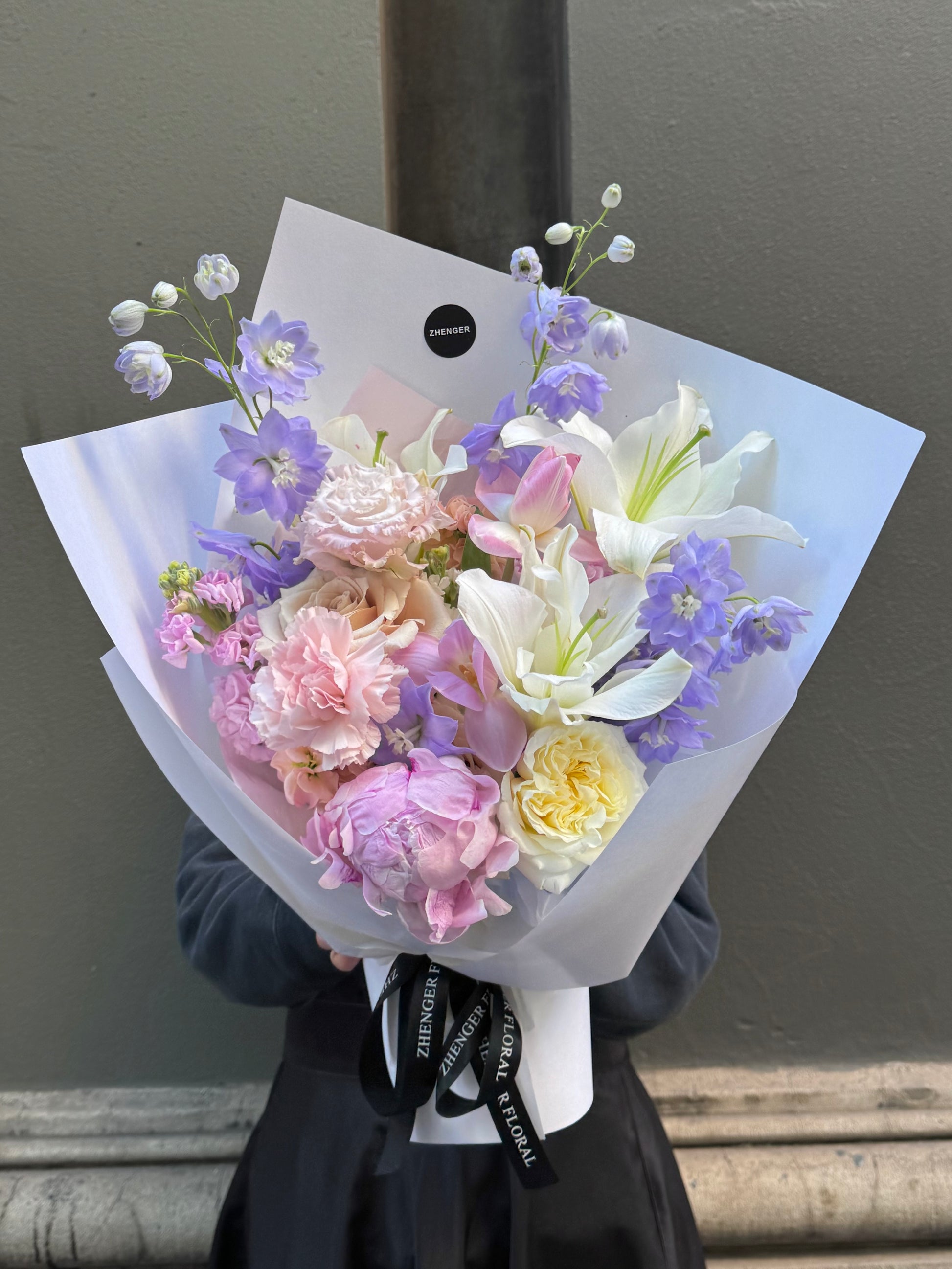 A graceful medley of pastel peonies, lilies, delphiniums, and soft garden blooms, “Morning Waltz” dances in shades of blush, buttercream, and lavender blue. Like a quiet sunrise in spring, this bouquet evokes serenity, joy, and gentle celebration — perfect for birthdays, graduations, or sending light and love.