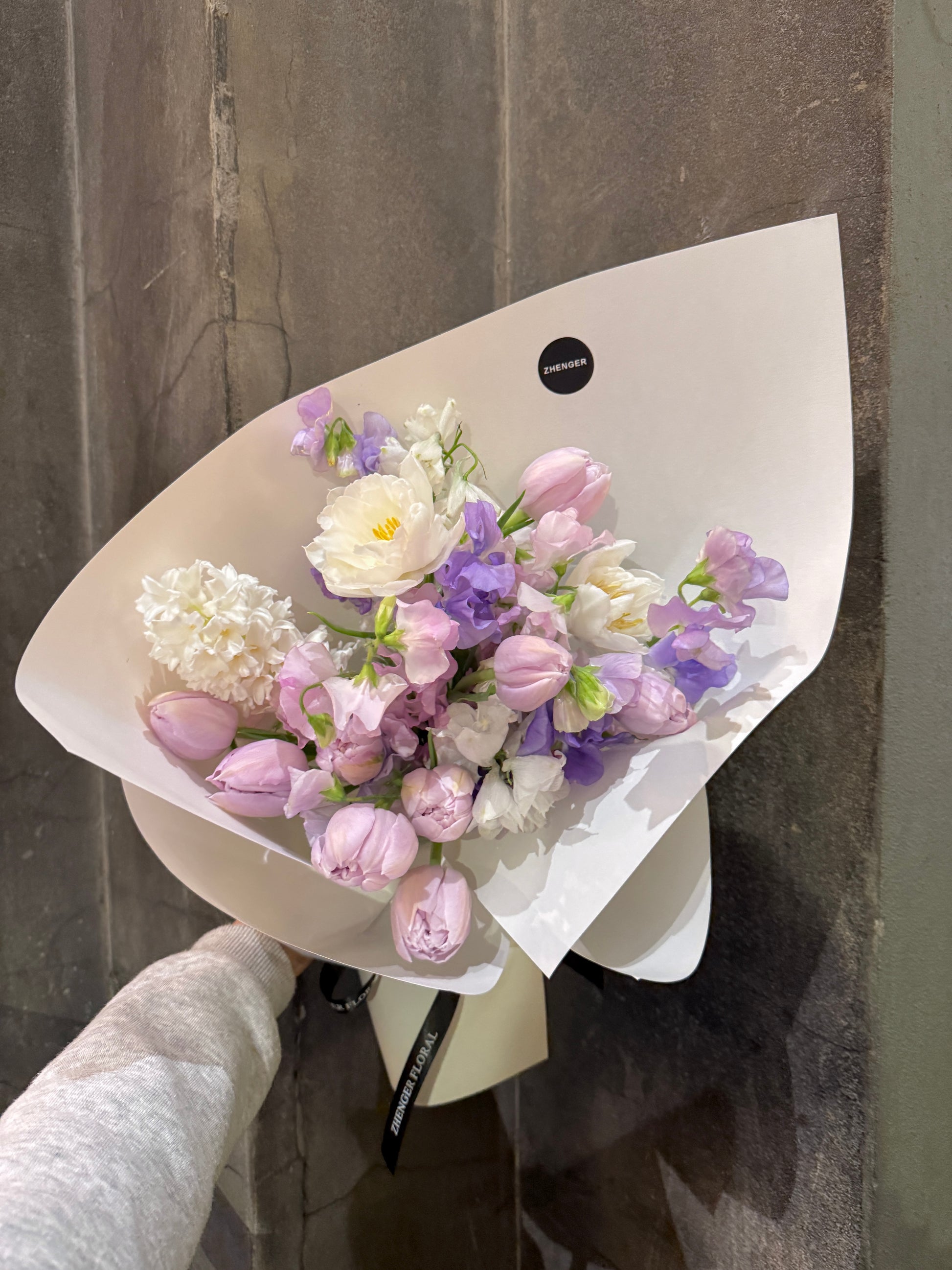 A soft and poetic bouquet of lilac tulips, sweet peas, and creamy blooms.