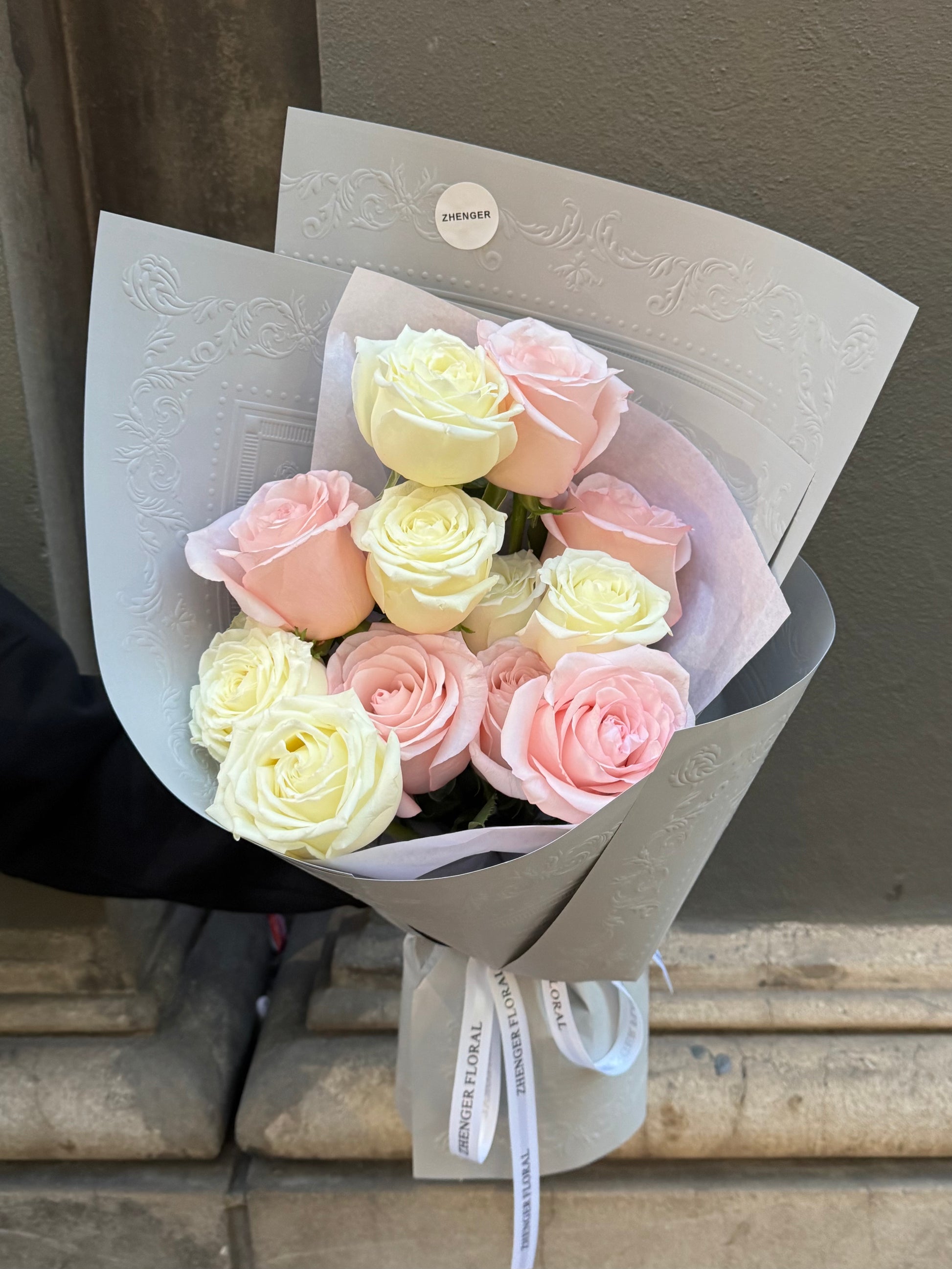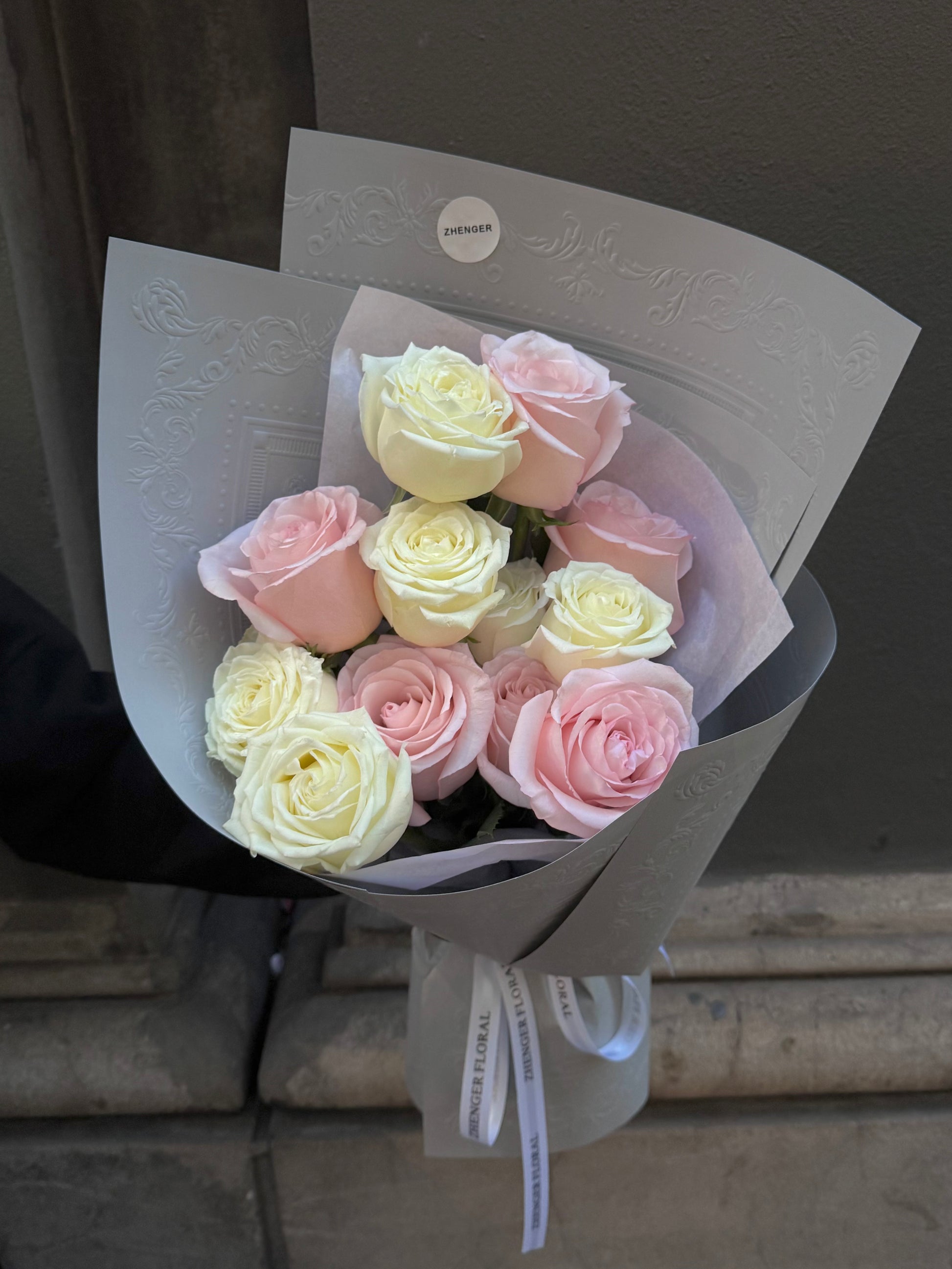 Gentle pink and white roses that feel like drifting petals in the sky.