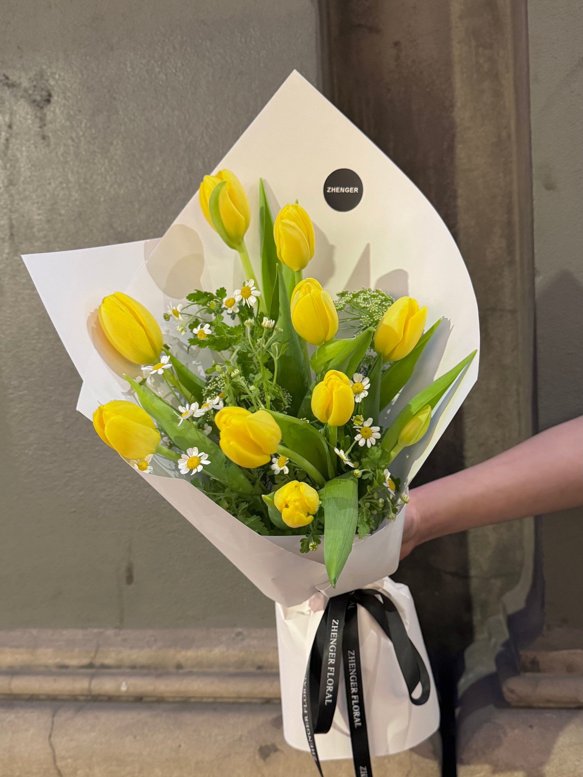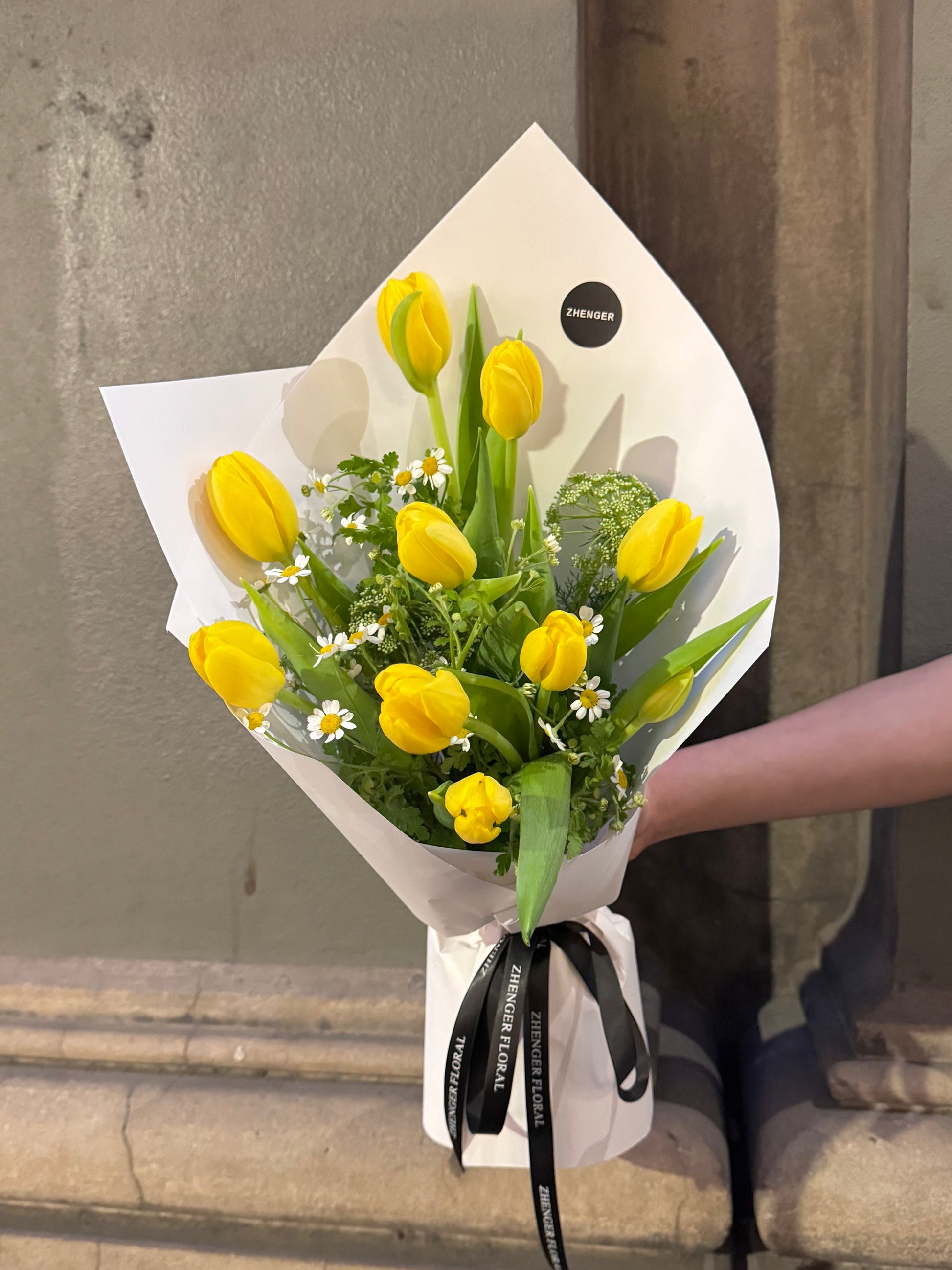 Radiant yellow tulips and cheerful daisies come together in a burst of sunshine. “Sunbeam Smile” is a joyful bouquet, perfect for lifting spirits, sharing laughter, or brightening someone’s day.