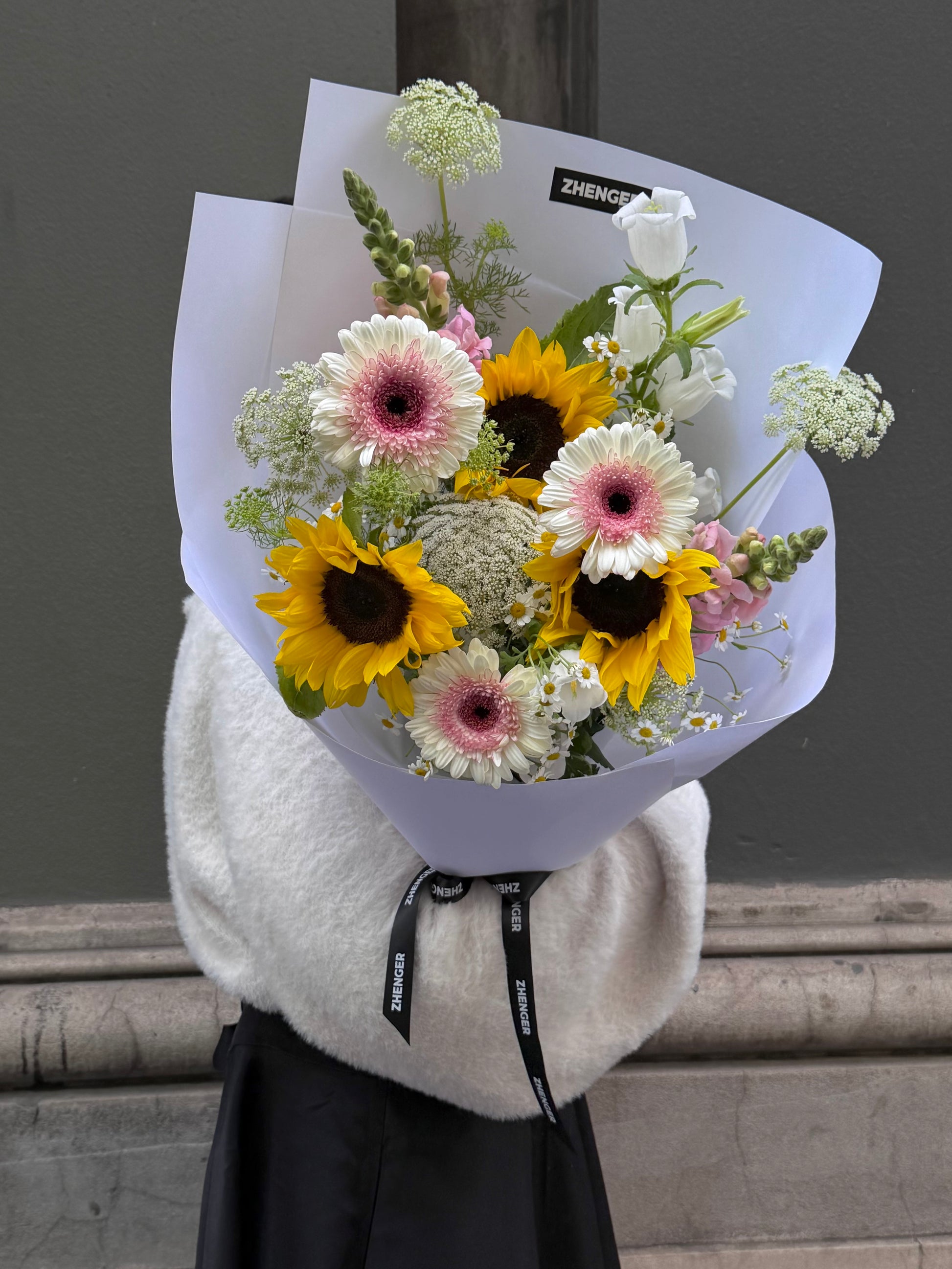 A cheerful and uplifting bouquet filled with sunny yellow tones and soft pastel accents. Designed to bring warmth, positivity, and a touch of playful charm, this arrangement is perfect for graduations, celebrations, birthdays, or brightening any special day. A fresh and gender-neutral bouquet that instantly lights up the moment.