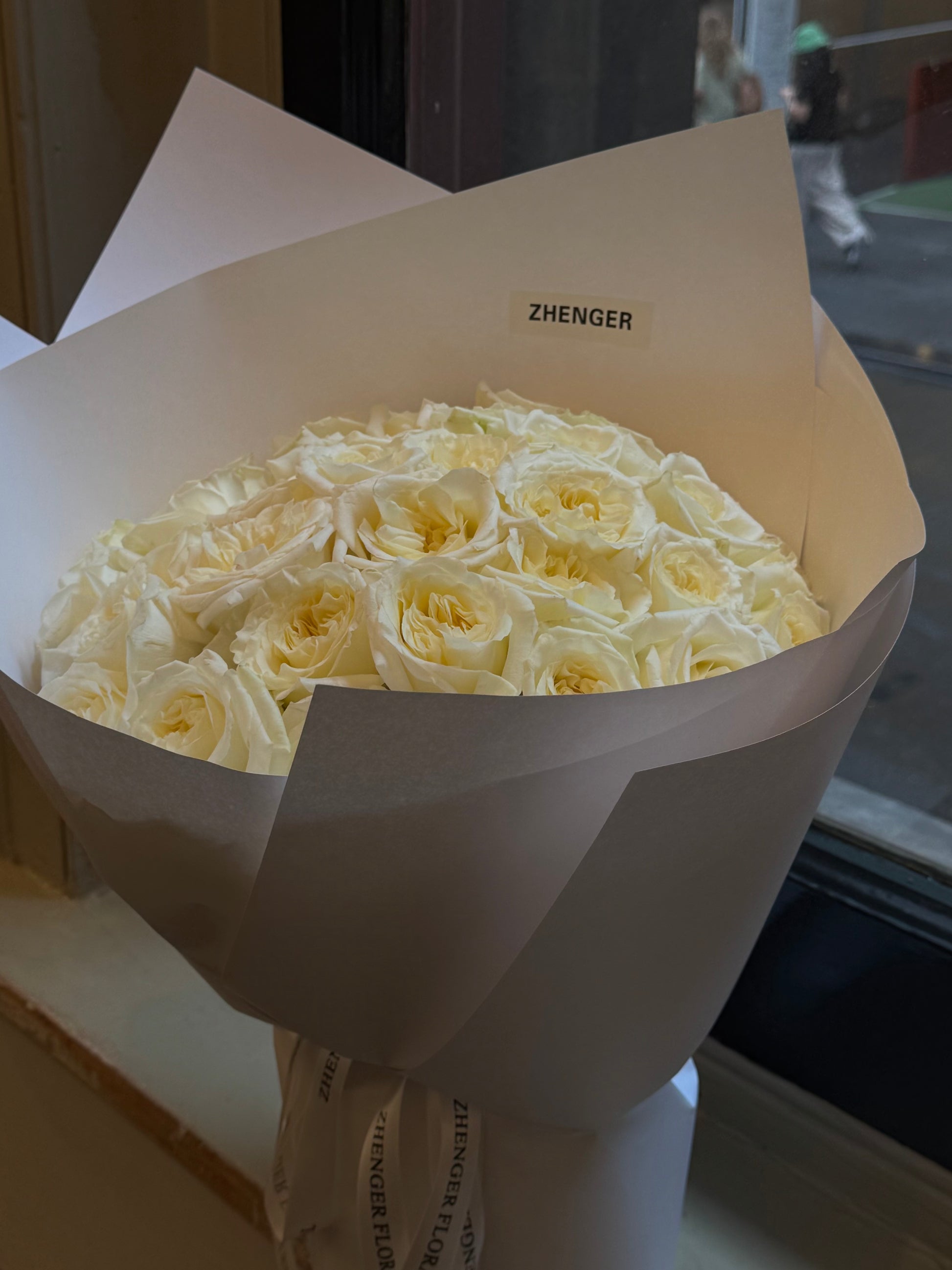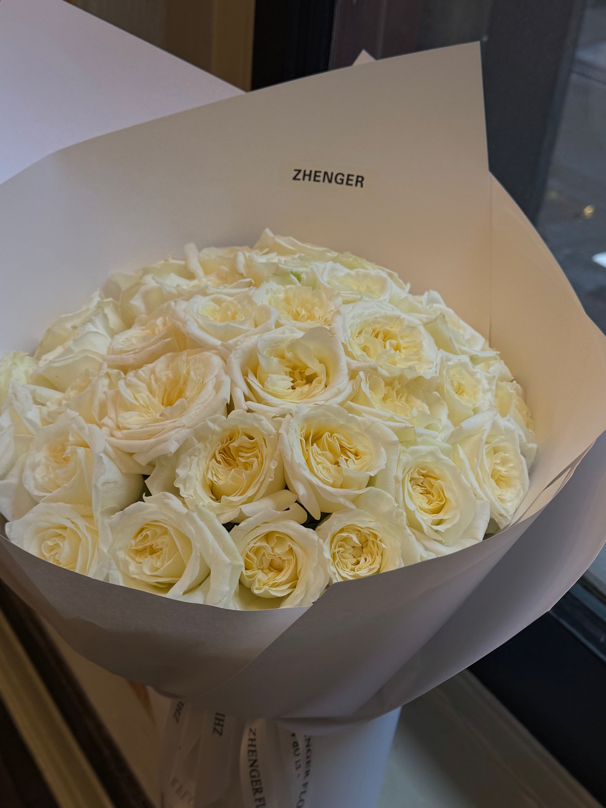 A bouquet of white roses, delicately infused with the soft, sweet scent of lychee.